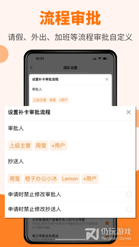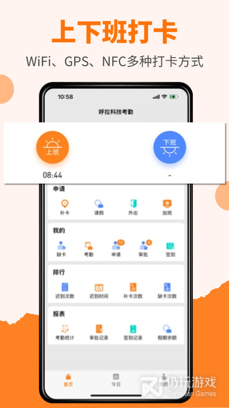 3、该软件通过一键式应用程序支持用户请假,出门,补办卡和在线加班