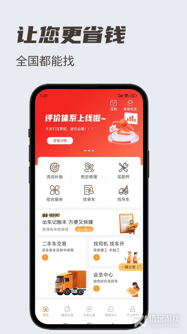 3、行车途中通过实时定位寻找修理、补胎、购买配件、移动加油、让行车不再难,提前发布审车信息。