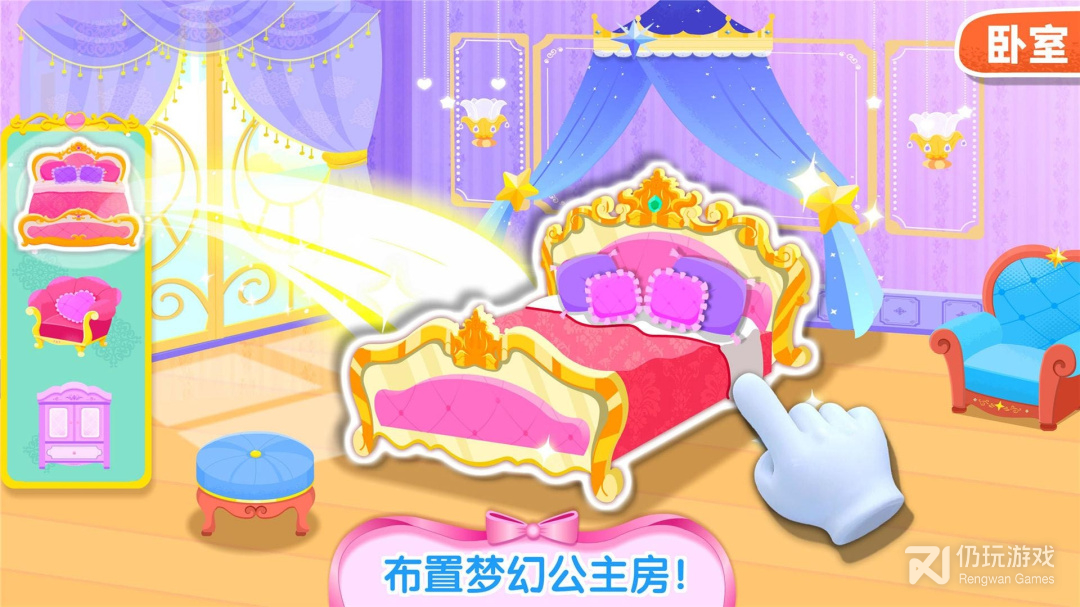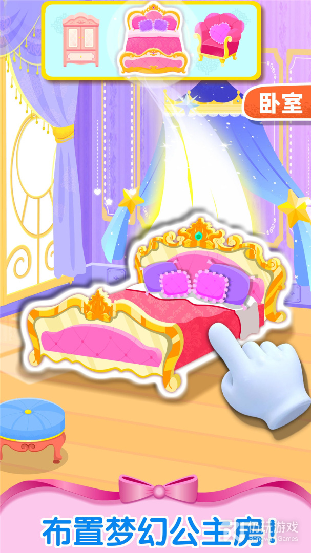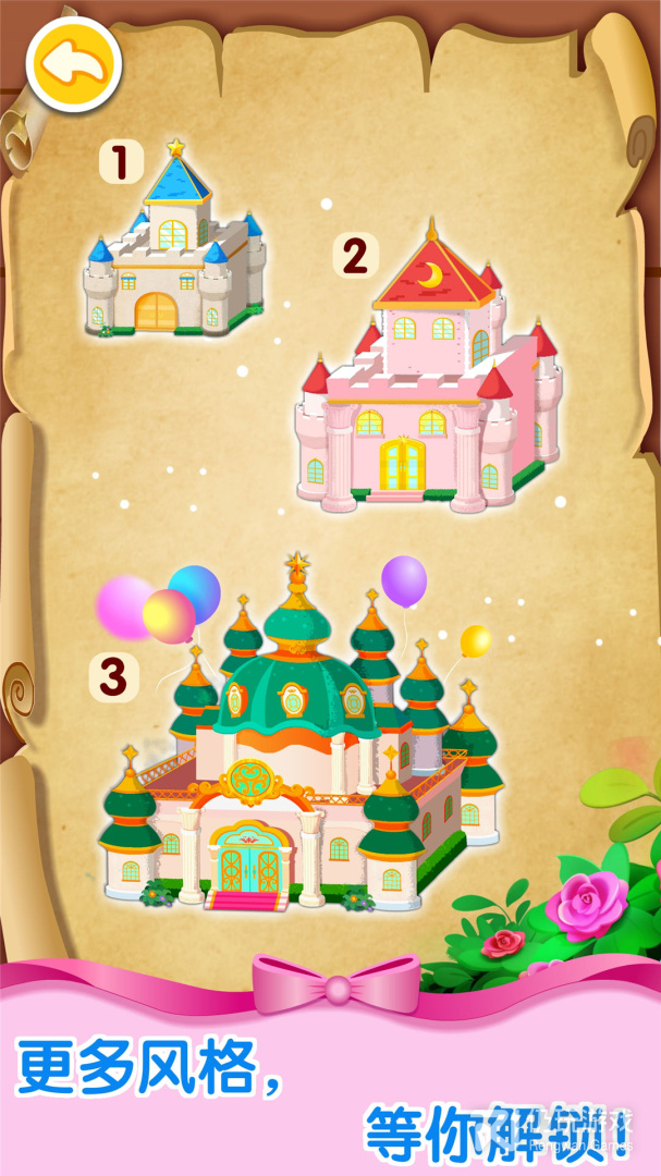 3、奇妙梦幻城堡中,共有5处区域需要装修,户外花园,宴客大厅,公主卧室,玩具房,泳池
