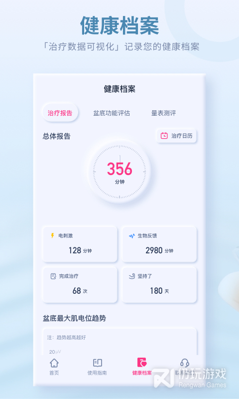 4、大悦盆底康复治疗仪app是实时记录女性康复过程的医疗app,在使用教学中可以了解到具体的使用数据,贴心的专属客服全天为你提供服务,专注于女性产后盆底恢复解决方案