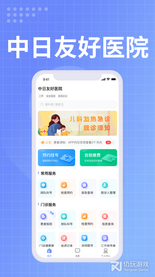 3、中日友好医院是由该院官方推出的手机服务客户端,在这里为大家提供最便捷最高效的服务,让大家以最快的方式享受绿色就医通道。多功能服务应用,方便你我他,患者可以在线查看医院导航,可以在线挂号预约、缴费、查报告等多功能便捷服务,还有海量的健康生活百科带你了解更多健康知识,欢迎小伙伴们下载