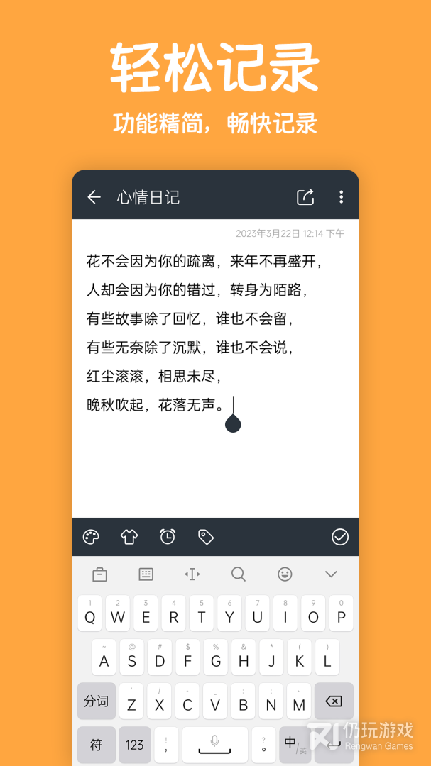 1、方便实用的手机记事软件记事本笔记带给大家,轻松记录每天要做的事情,添加待办和时间,不怕自己忘记,提供日记和笔记功能,编辑工具齐全丰富,多种记录模式,文本、图片和语音都可以,还能对自己的日记进行分类和加密,查找起来更方便,也不会让别人看到自己写下的内容