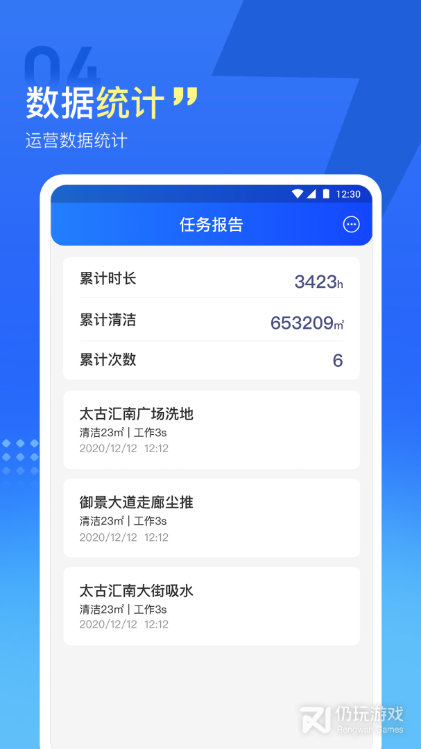可查看机器历史运行数据,累计工作时长、清洁面积和清洁次数,以及每次任务报告。