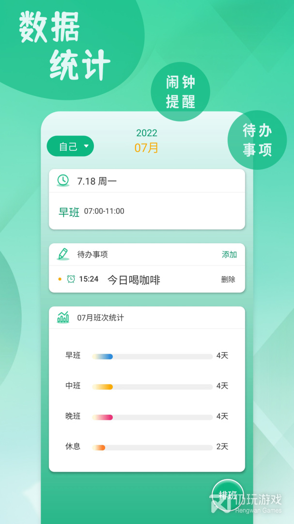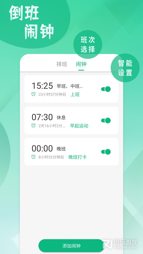 2、对于在酒店上班或者需要日夜颠倒的人群来说,这款软件就让工作变得简单。软件可以根据你的白班夜班时间进行上下班提醒,搭配上温馨的音乐,让用户一整天的疲劳都消除。有需要的快去下载使用吧