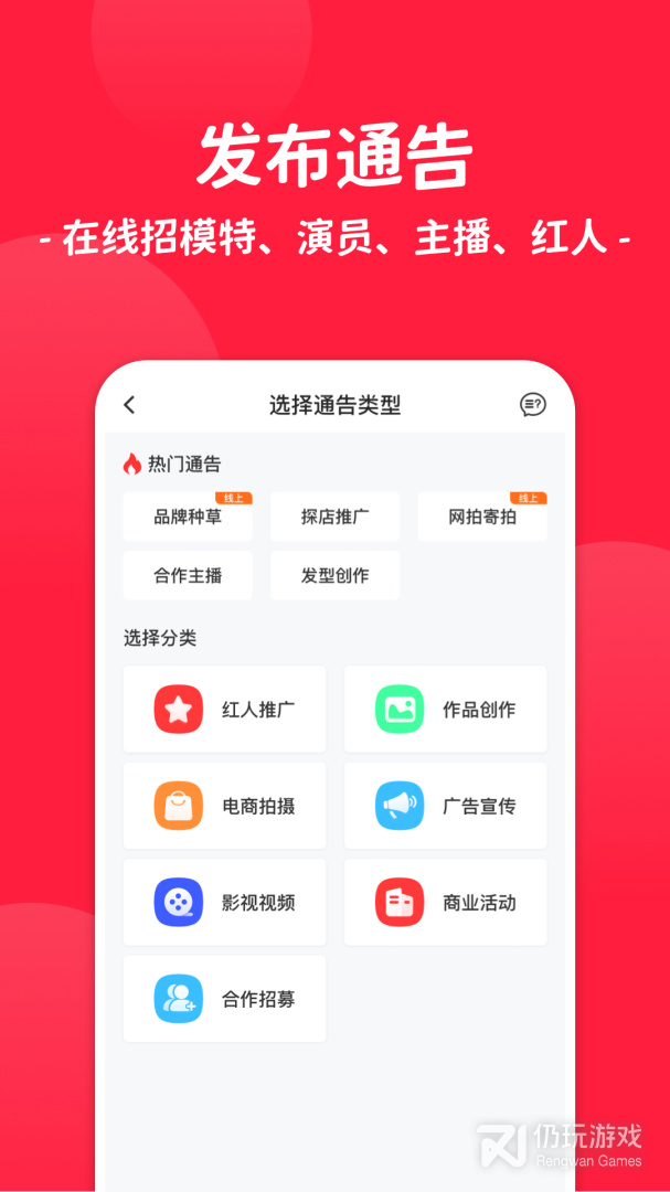 6、用户自己也可以直接在平台上发布各种不同类型的通告内容,包括品牌种草以及探店推广订单,还有更加丰富的商业活动以及影视内容订单,寻找专业艺人