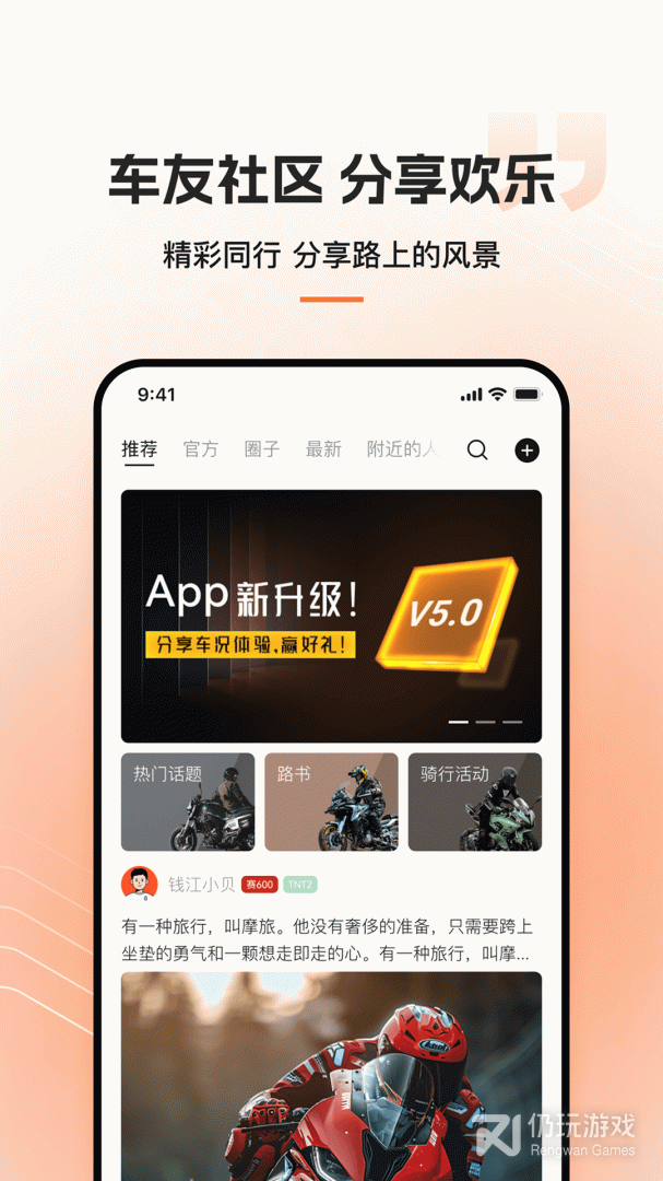 3、钱江智行联动你的摩托车打造智能化车联网操控,让你和你的车高度协同,并且组建各种车友社群和车友圈子,一起分享玩车心得,组织各种线下活动等等,下载钱江智行一起试一试吧