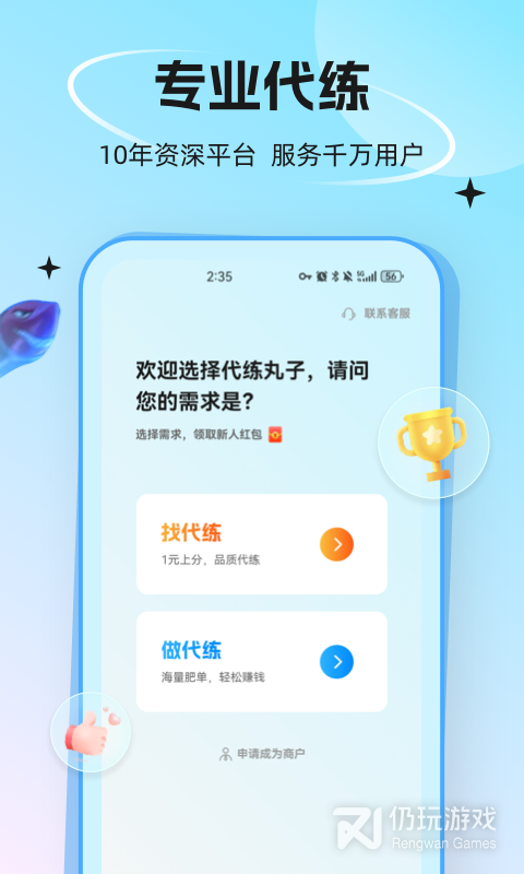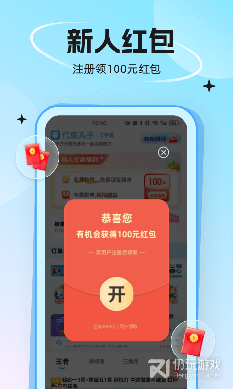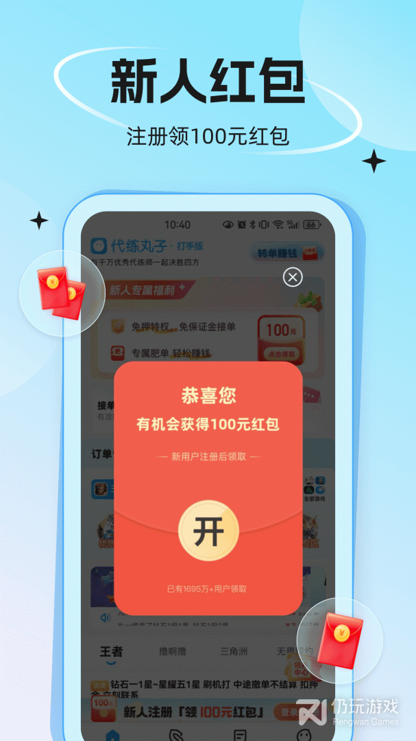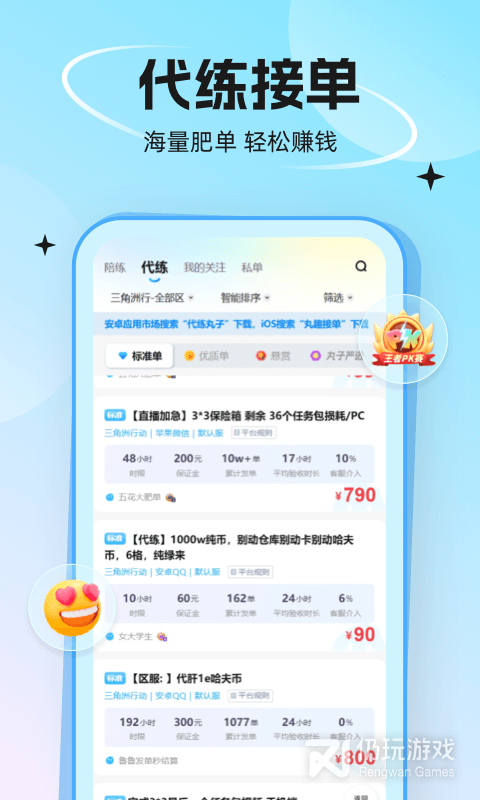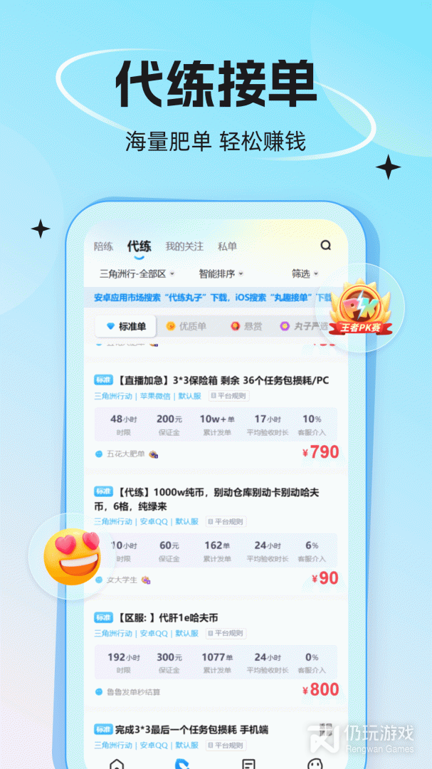 3、使用代练丸子开启你的做代练/找代练之旅。这是专业的游戏代练接单APP,您可以在海量的代练订单中,找到自己中意的高价代练订单,作为行业领先的代练软件,代练丸子有信心给您优质的服务体验