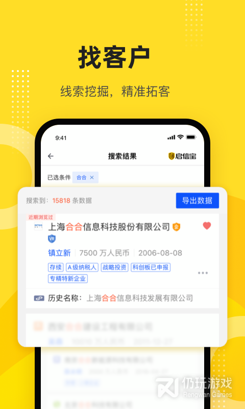 1、精准拓客,每日准点推送当地新增企业信息,智能搜索企业。