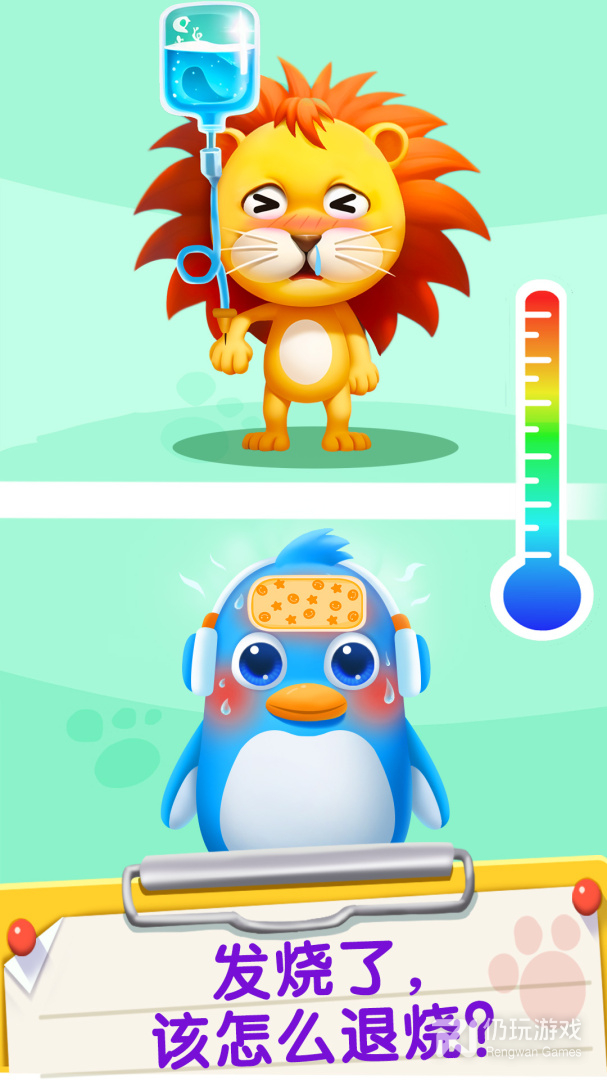 在这款游戏当中,小朋友跟着长颈鹿医生,选择合适的治疗手段来帮助小动物治病吧~~