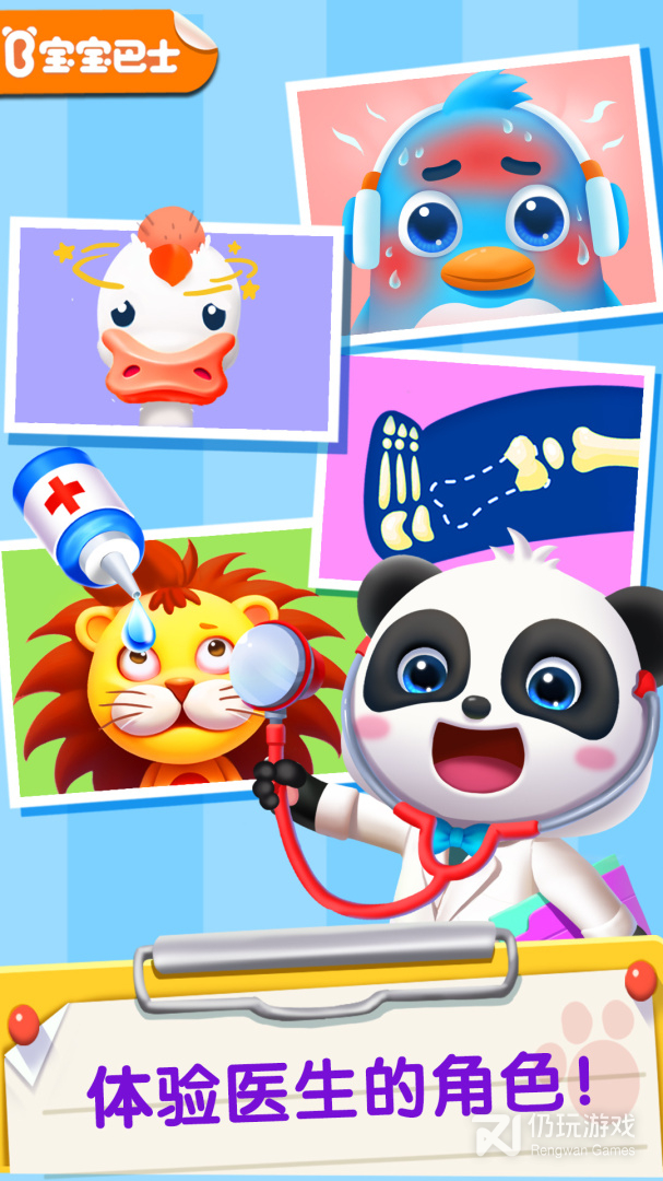 4、在宝宝医院中,宝宝将扮演一位医生,他要跟着长颈鹿医生一起,在动物医院中给小动物门治病,游戏操作非常的简单,让宝宝快速学习到日常生活的医用知识