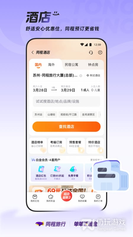 同程旅行app是由同程网络科技股份有限公司开发并推出的一款旅行服务性app,该app支持订酒店,预定车票,飞机票等,同时也可以查询全国各地的景点门票,周边游玩设施详情以及各个景点或者游玩设施的网上评价,让你第一时间直观的了解自己的目的地方便,随时随地查询并预订酒店、机票、景区、度假、租车、演出等旅游服务,并且可以免费阅读全球最强劲中文旅游攻略,方便制定您的出行计划,是您出行必备的实用助手,为您的出门旅行做好充足的准备。