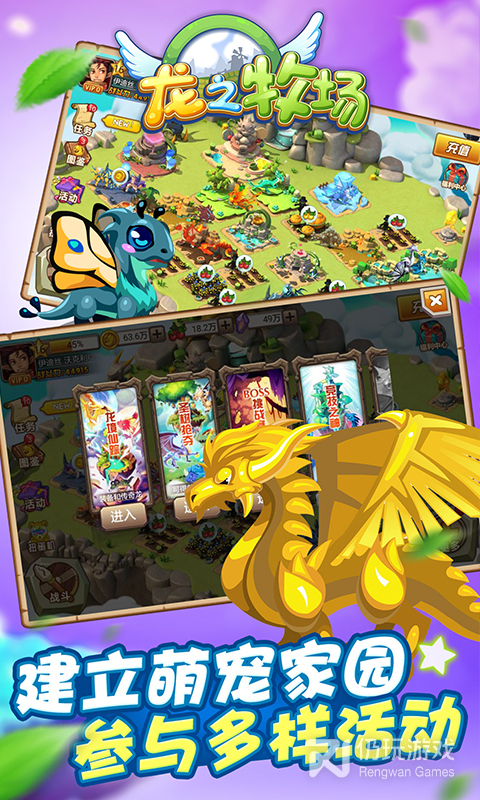 2、进行牧场经营。各种萌系卡通龙宠的收集、养成是牧场经营的最终目标!游戏操作简单,画面明快活泼,在延续了牧场开发、宠物培育等SNS经典玩法基础上,大胆尝试突破创新