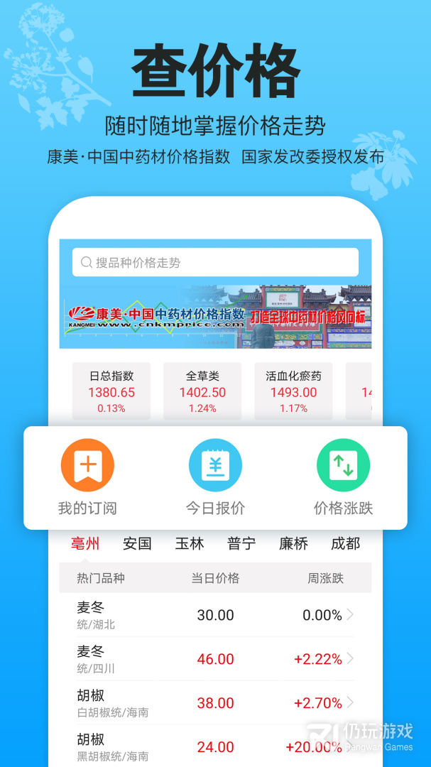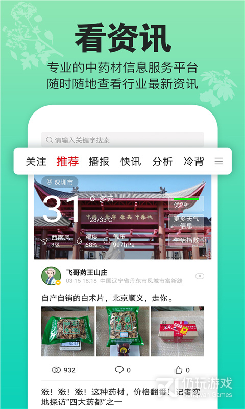 2、康美中药城,专为中医药行业打造的采购批发平台。用户可以在这里发布供应、发布求购,浏览药材资讯、价格指数、药材交易、药材百科等,实现数据共享、资源共享,助力行业共同发展