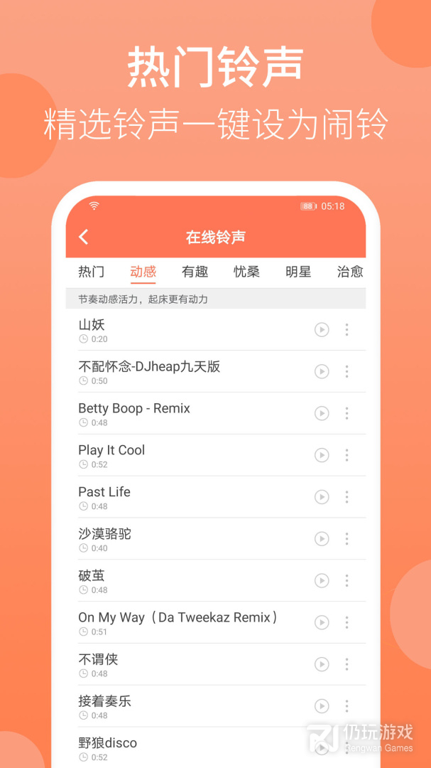 6、提供了在线铃声,选择分类即可进行播放试听,还支持下载铃声
