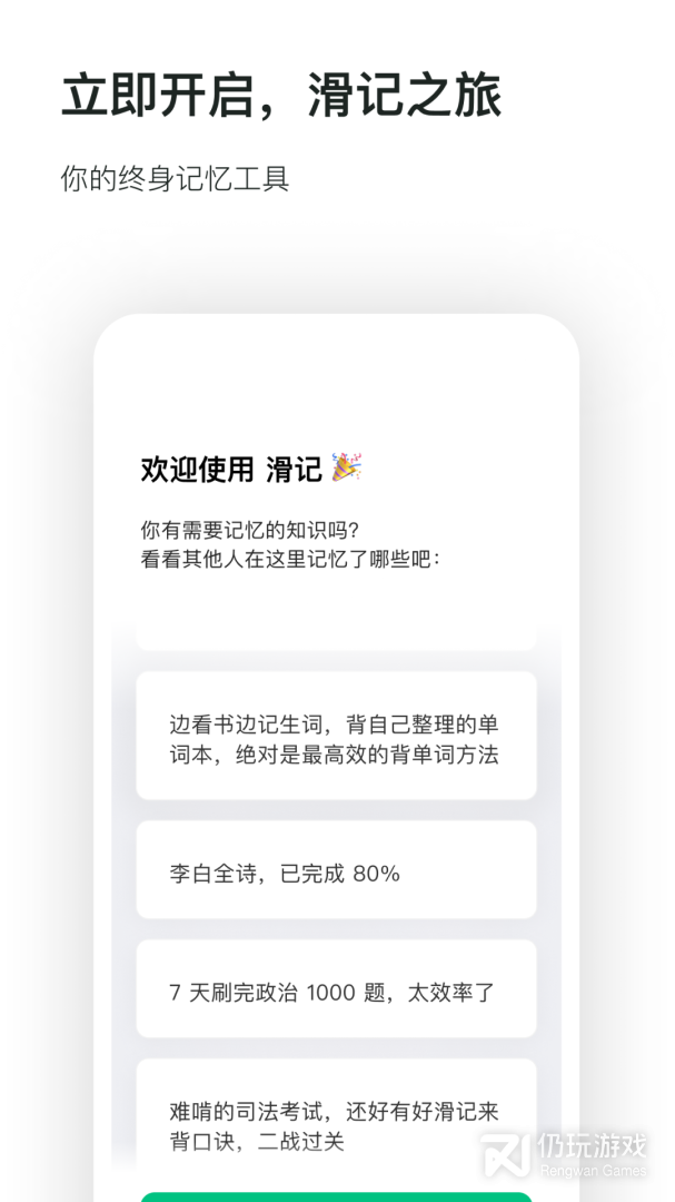 滑记是一个提高记忆效率,轻松应考的App,运用间隔复习理论,通过AI算法帮助用户规划学习计划.将化身你的私人教练,用最短的时间帮你达到最好的应试状态.