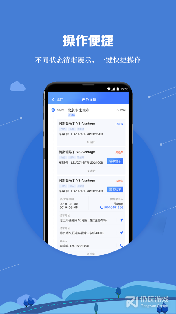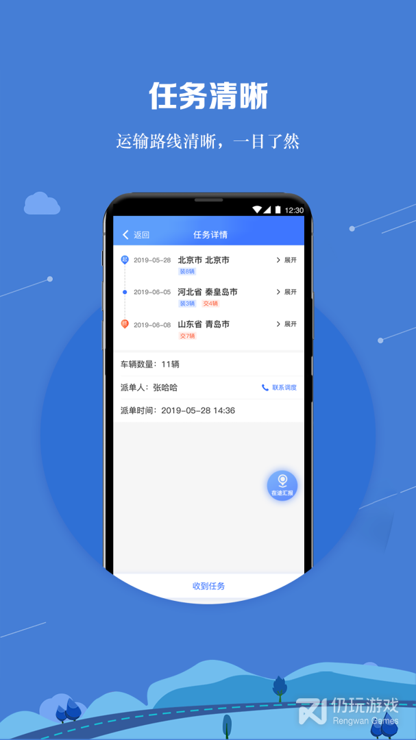 物流公司自有司机可通过APP接收公司指派的运输任务、执行验车、 在途汇报、交车等。