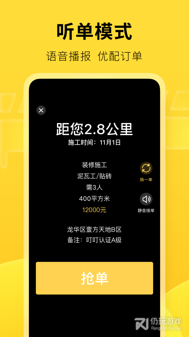 无论你是水电工、泥瓦工、木工、油漆工还是搬运工等等,在这里,你都可以找到你能干的活,语音实时播报,优配订单。
