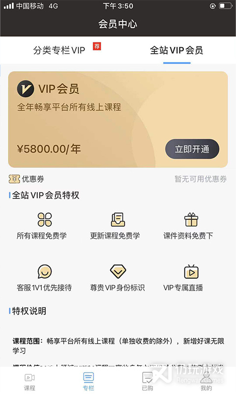 4、点击“课程”进入课程页,近500节实务干货课程,任君挑选。点击购买,即可观看课程。更有会员专属权益,全网好课,无限畅看