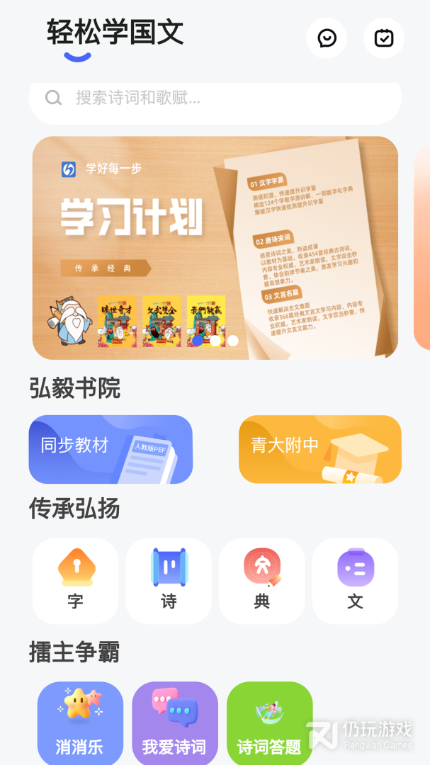 1、该软件为用户提供非常丰富的语文学习资源内容,包括了汉字字源、唐诗宋词、国学经典、文言名篇、经典名著、中华文化六大版块,在这里大家可以随时随地进行学习,能够很好的提升学生的语文成绩