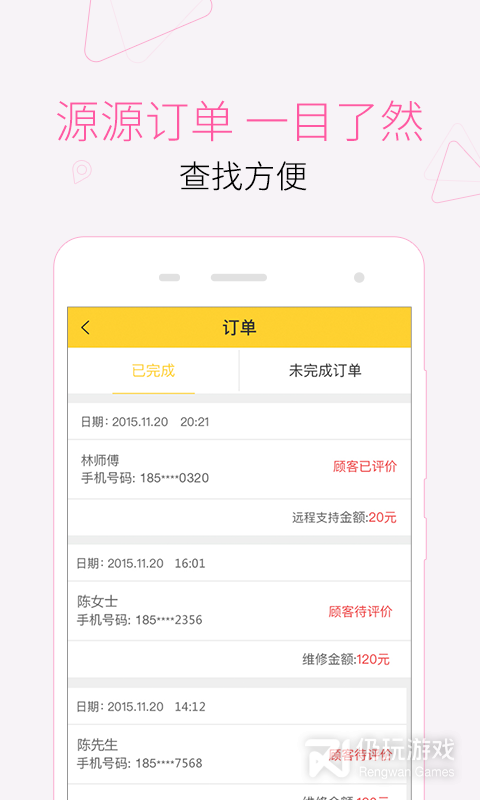 源源订单一目了然,师傅更方便查订单,全部订单信息线上随时可查看;