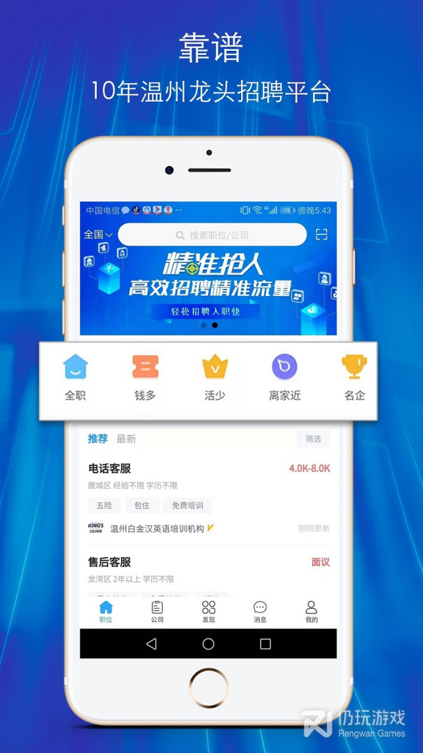 2、专为温州地区本地市民所打造,这里提供了海量优质的工作岗位,安全可靠,可以任意挑选你喜欢的工作,感兴趣的欢迎前来下载体验