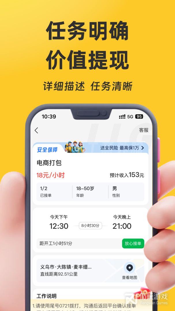 2、自主决定工作时间与地点:自动推送周边最适合零工,一键接单,在家门口就能挣钱