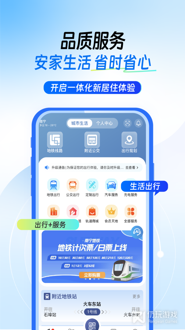 南宁轨道交通软件是南宁地铁的官方app,服务于中国广西壮族自治区南宁市的城市轨道交通.为南宁本地居民提供便捷的地铁出行服务,用户可随时随地查询地铁信息,一键充值消费,快来下载吧!