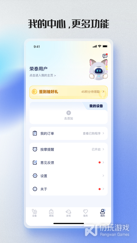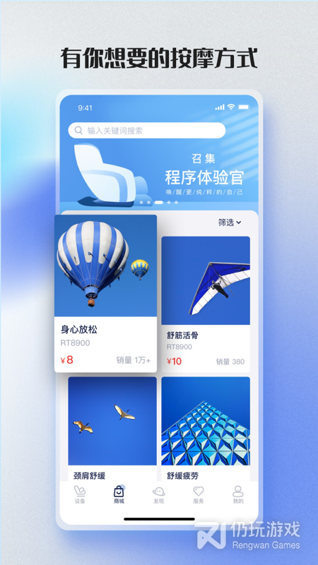 2、荣泰智能下载,配合旗下按摩椅打造的智能终端,帮助用户更便捷明了的调控按摩椅,通过荣泰智能调整按摩模式,记录按摩数据,还可以共享按摩