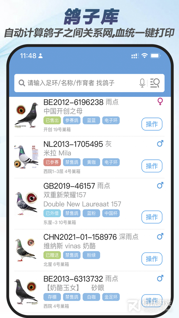 2、用户通过拍照或者语音识别,就能快速找到所想要的鸽子的全部资料。还可以在线实时的对鸽舍进行管理