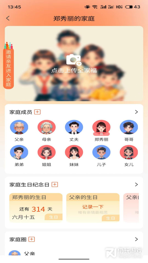 2、可以与家人在平台里进行沟通交流,增进感情,还可以看到家庭成员的个人信息,一键分享有趣的事情