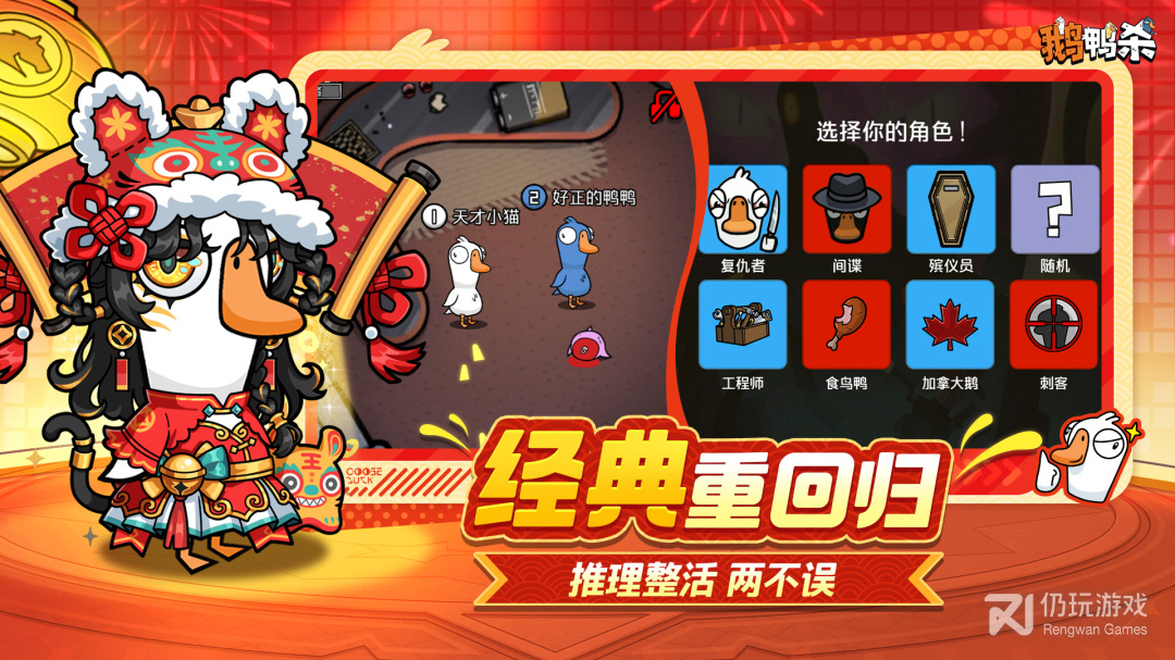 2、在游戏中玩家们将被分配成鸭和鹅两个阵容,每一个玩家都有着自己的任务,你需要不断寻找线索来发现所有人的身份。游戏玩法非常有趣,十分考验玩家的智力,玩起来紧张刺激