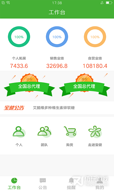 3、i宝健是由宝健官方推出的手机商务办公服务软件,线上公告通知查看,个人管理,团队,购货,个人拓展数据,营销业绩,自营业绩等一目了然,需要的可以下载i宝健使用