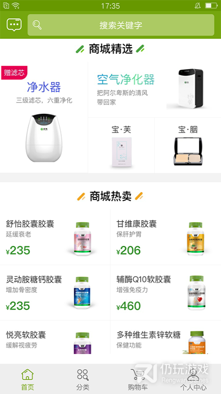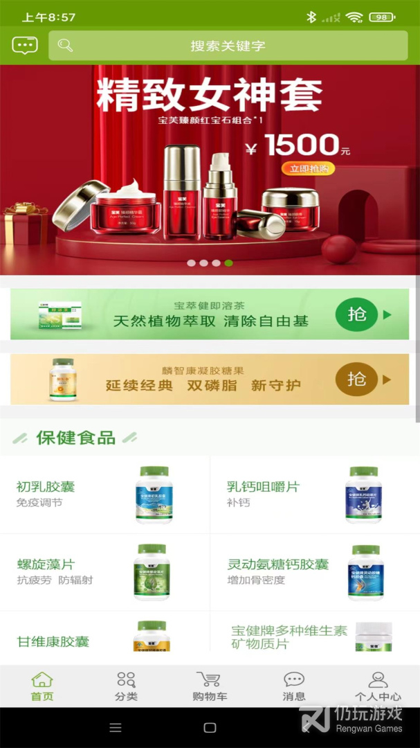 3、其中在首页中,支持用户搜索相关保健品的关键词,以及保健食品、营业食品、健康家居、日化护肤等;