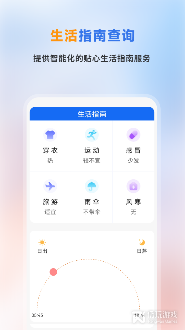 -24小时、15天日天气预报、生活指南(穿衣指南,运动指南等)