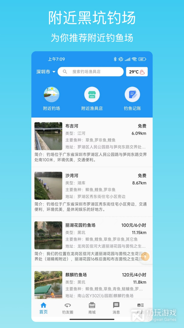 3、查看您附近的钓场资料,文字和图片记录您每次钓鱼的渔获。