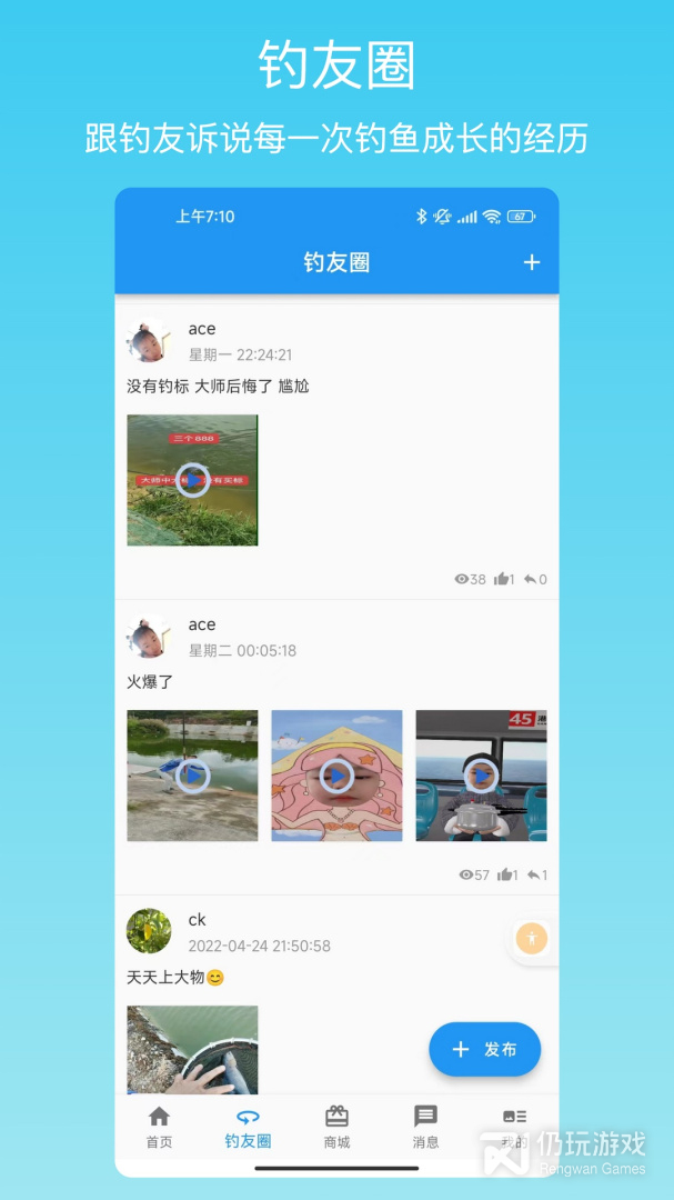2、精彩的捕捉和互动分享。它提供方便快捷的文字编辑和视频分享工具,让你发送分享钓鱼的快乐,发布视频,参与钓鱼话题的讨论,完美记录钓鱼生活的每一个新鲜瞬间
