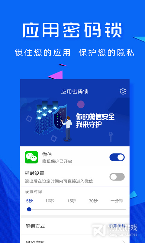 应用密码锁可以锁定手机社交软件、相册、游戏等任何应用程序,保护您的隐私