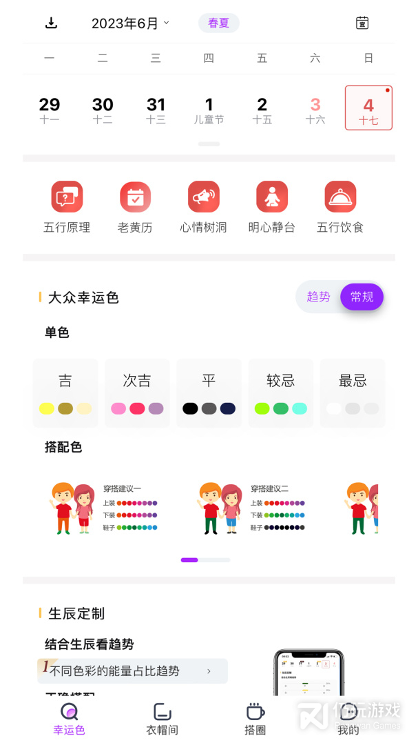 1、五行穿搭下载,一款五行与穿搭相结合的综合应用,通过五行穿搭小伙伴们可以根据每日幸运色来搭配服饰,调节气场与能量,感兴趣就来下载了解