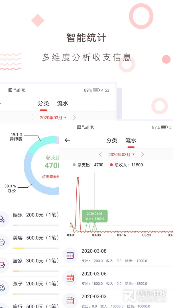 2、轻松记录你在日常中的各种收支数据,并根据分类来为你完成图标统计,一目了然的为你分析账目的数据变化
