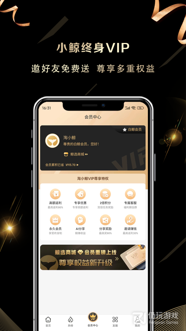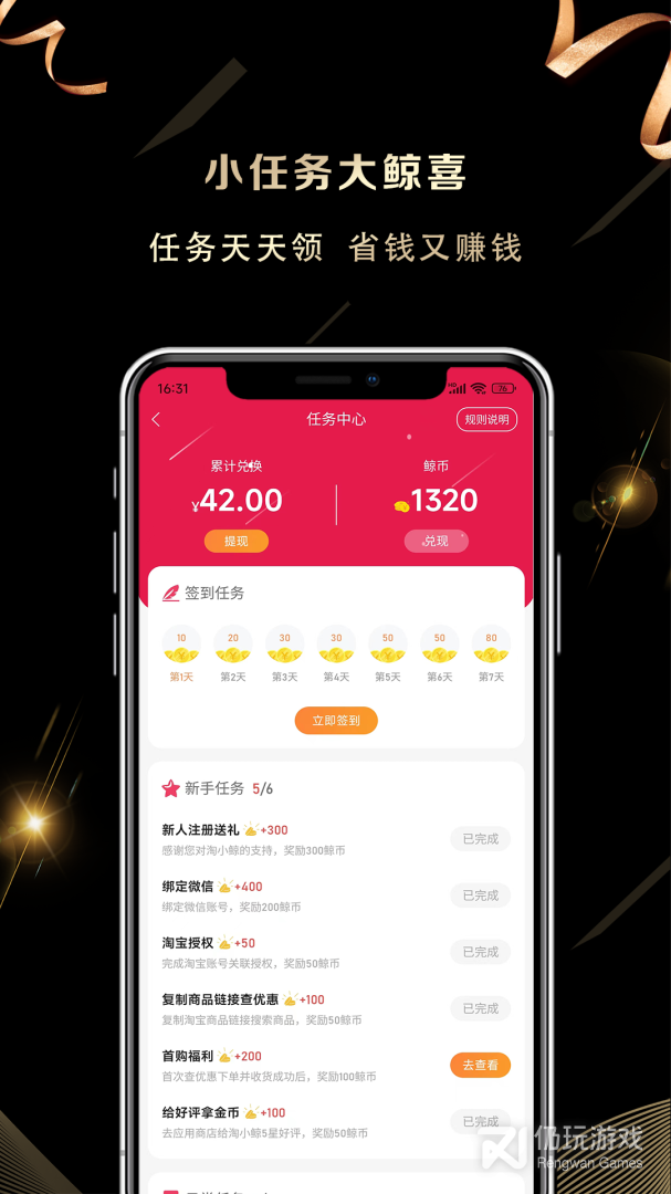 1、淘小鲸app是很多喜欢网购的朋友非常好的选择,它不仅可以购物省钱,还能购物返利,平台也有大量的福利给大家,只要你能按时完成任务就能领取很多奖励,而且还有多重会员权益,让你享受更多的VIP好礼,大家喜欢的话可以来下载哦