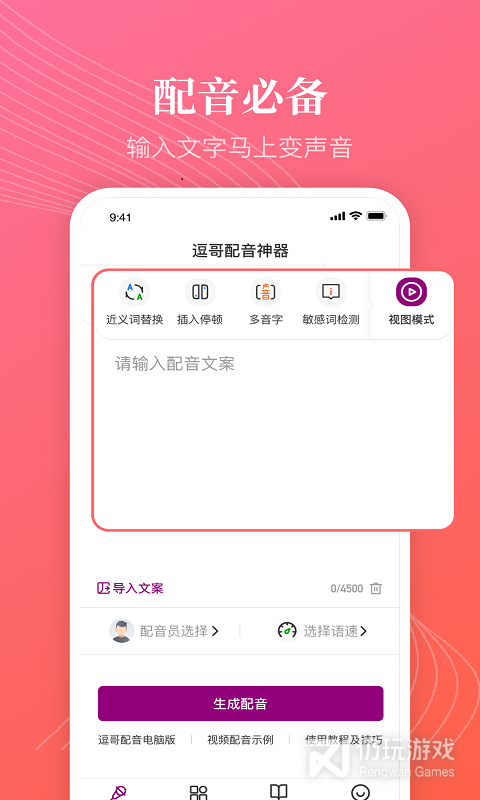 逗哥配音神器,文字一键转语音,100+个抖音热门配音员,情绪可调,100W+短视频达人在使用。简单易用,抖音小白秒变声优达人,多音字纠正,敏感词检测,近义词替换,对话配音,文案导入,语音输入,变声效果处理,为你的短视频创作助力。