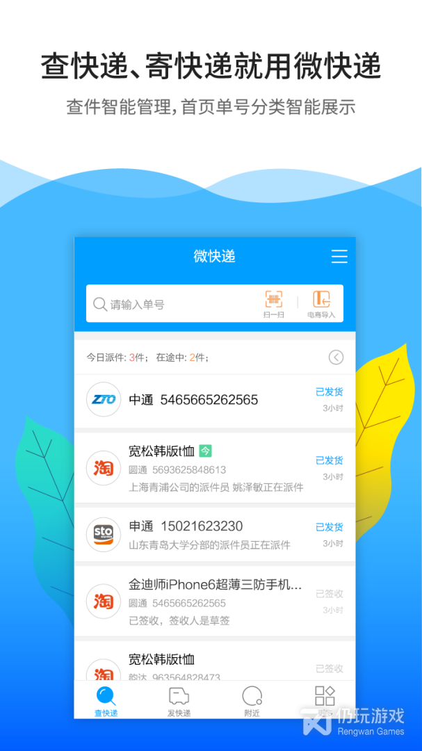 4.快递单管家:自动保存历史查单号并归类,随时查快递,随时同步到各设备;