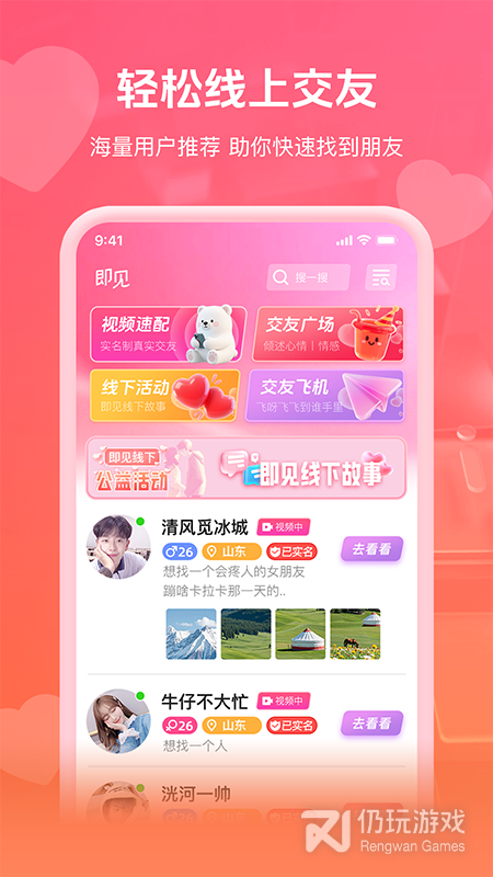 1、即见app是可以给更多用户提供交友便利的平台,该社交系统会让大家更喜欢,独特创新的交友玩法会让你玩的很开心,而且随时随地参与各种游戏开黑活动也是可以很好打发自己时间的,给广大单身用户们也带来了更多相亲交友的好机会,这样的社交方式也是很值得推荐的