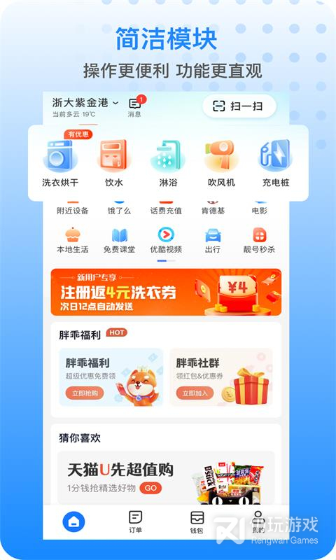 胖乖生活是一个自助设备操控软件,软件中的一系列功能让用户不用出门也能直接使用周边的各种设备,可以在手机上满足大家的洗衣、沐浴等需求。软件中的功能很全面,还有出行打车等多种便利服务可以体验,为大家的生活带来更多舒适服务。