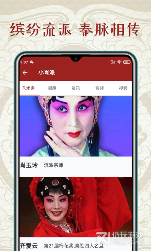 1、走近戏曲,带你领略秦腔之美。秦腔迷软件中有着丰富的秦腔戏曲,包含了经典秦腔曲目、各种精彩唱段视频演绎,大家可以自由的选择阅览,并且这里还有各种的剧照美图、伴奏等多种内容,可以很好的满足喜爱秦腔朋友哦