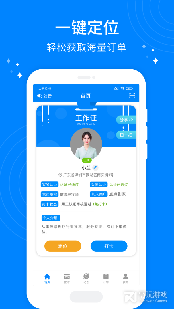 2、按个摩技师端是一个服务于按摩技师的接单工具,致力于为技师提升线上接单能力和处理订单的能力。使用按个摩技师端你可以实时定位,不用坐班,在线接单