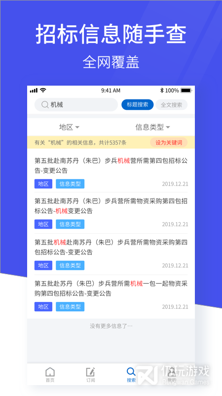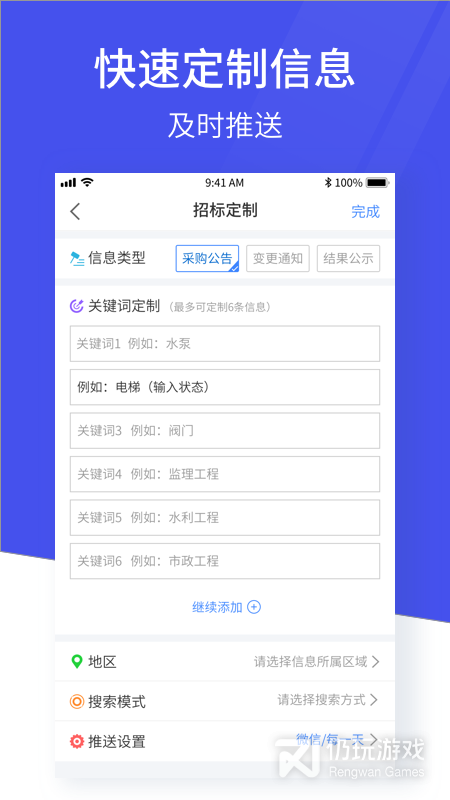 三、信息订阅:通过对用户设定的关键词、信息区域、信息类型、搜索模式进行智能精准匹配,利用多种通道推送,为用户紧盯市场动态,更多商机快人一步;