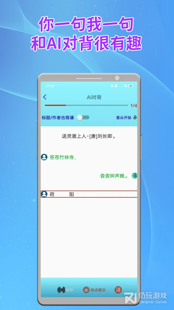 长嘴鸟Ai背诵App依托AI技术,一站式满足学生背诵过程中的点读、意思讲解、逐句背诵、整体评分、背诵视频录制及分享打卡等需求;对于没有时间带孩子背诵古诗文及课文的家长,将孩子交给长嘴鸟Ai背诵App,它可以在无需家长任何干预下指引学生一步步快速完成背诵,解决家长一大头痛问题。