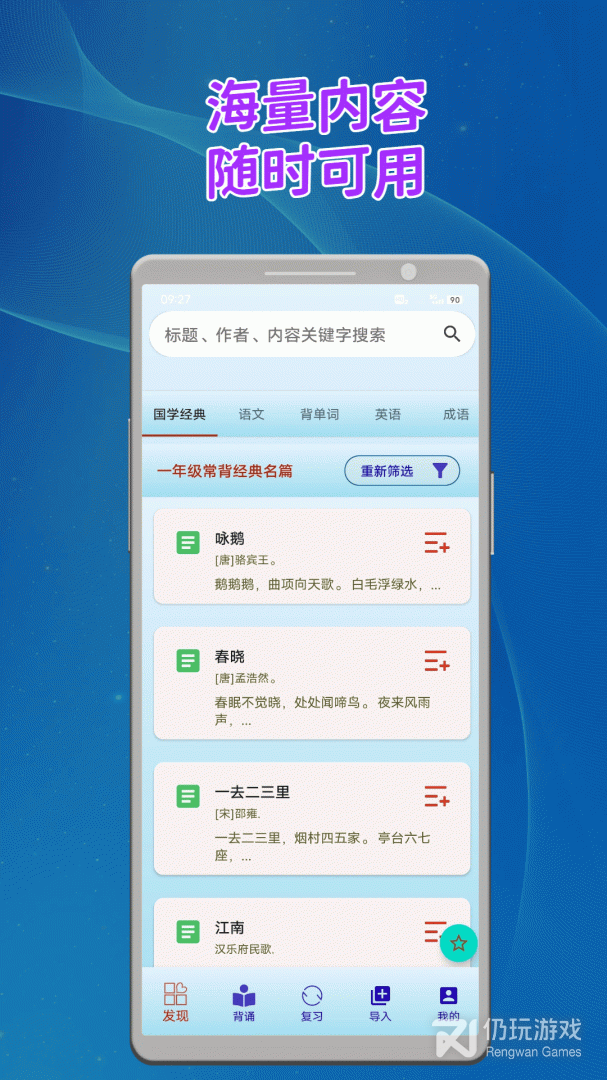 4、涵盖常背国学经典古诗词、曲、文言文及名著片段