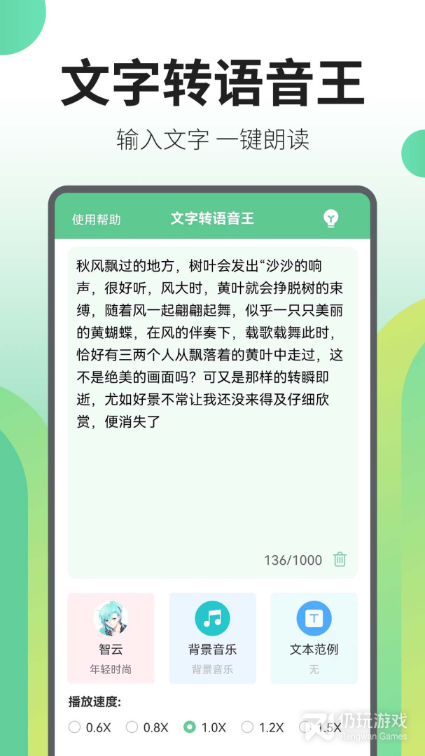 2、用户可以通过文字转语音王将文字内容转换成语音文件,app中提供了多种声音,还可以添加背景音乐